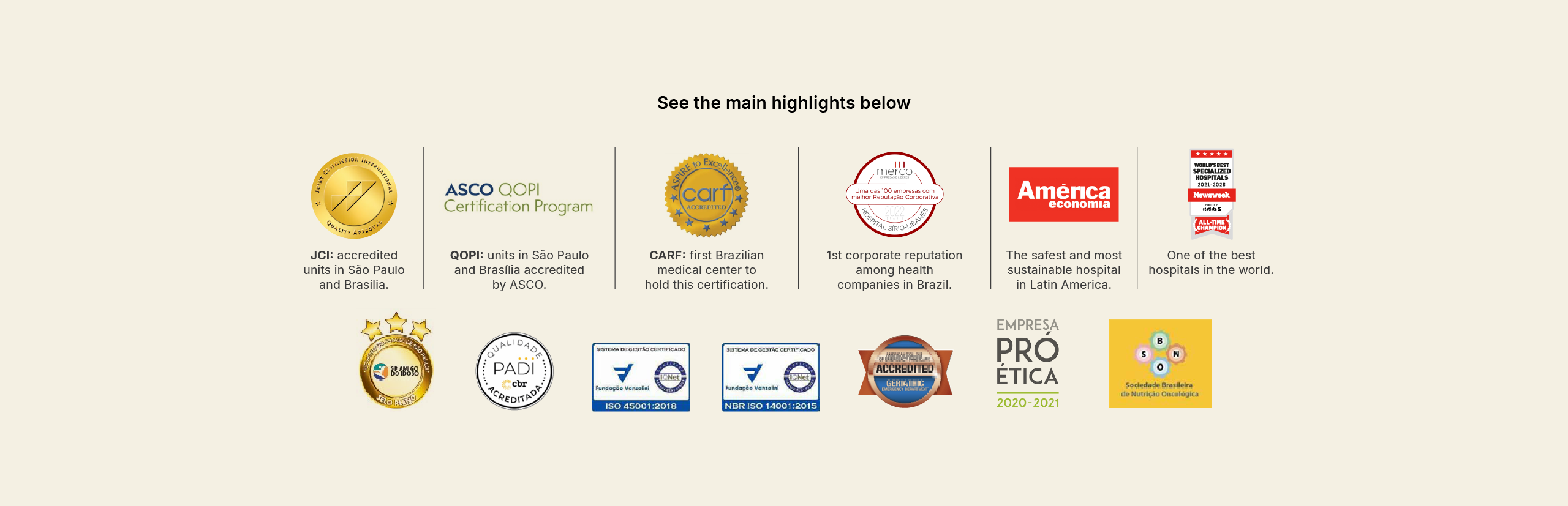 Sírio-Libanês complies with the strictest quality standards, recognized by the main accreditation agencies in Brazil and in the world. We hold more than fourteen clinical and managerial certifications and accreditations and six environmental and governance accreditations.